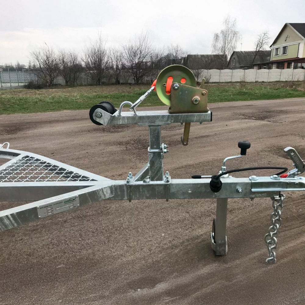 | Комплектація причепа | Колеса,Опорне колесо,Лебідка,Стяжний ремінь,Дві бічні підніжки,Середній трап |