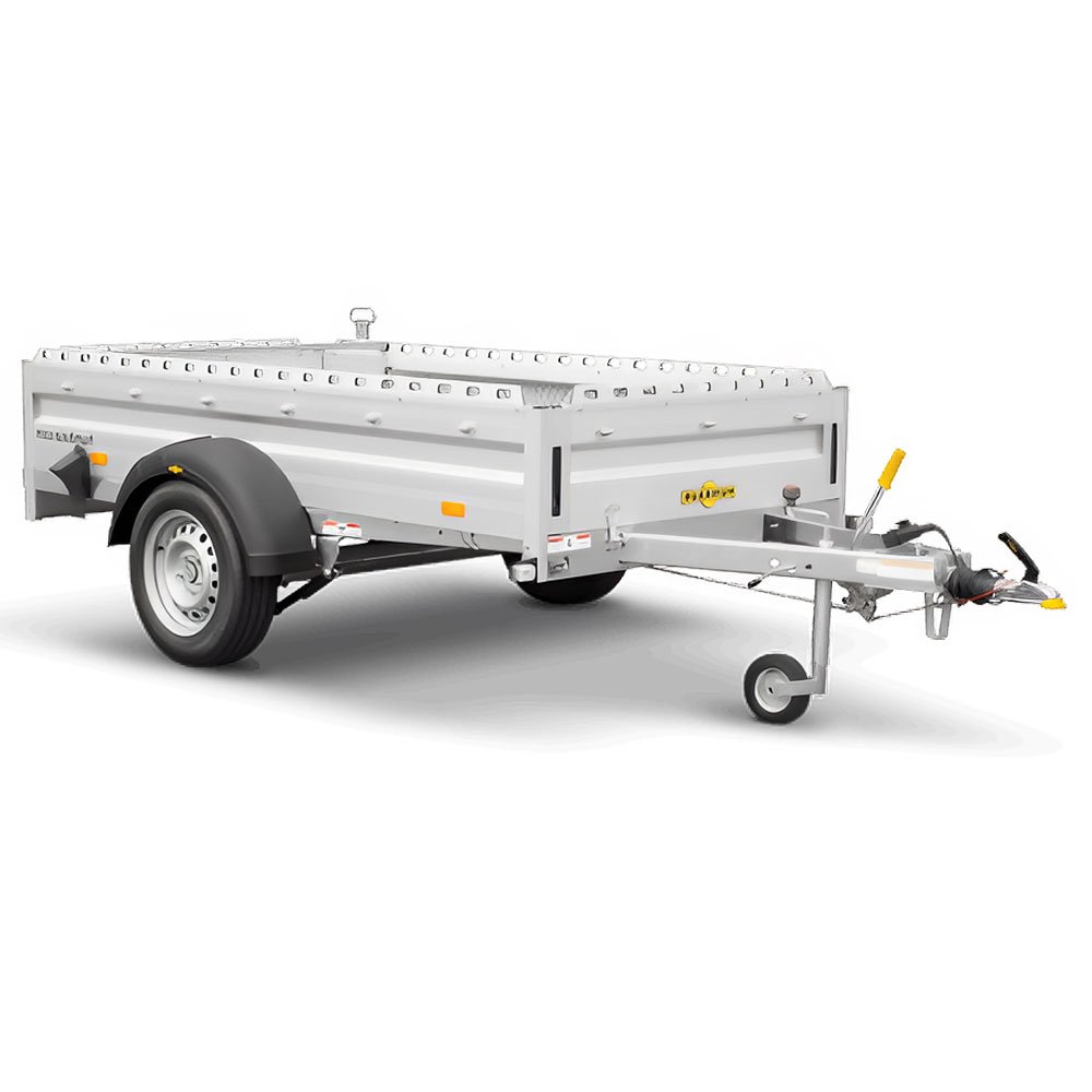 Це міцний низькорамний одновісний причіп/ Унікальна конструкція рами та бічних стінок виконана з анодованого алюмінію, з V-подібним гарячеоцинкованим дишлом, підлогою товщиною 15 мм і стінками висотою 40 см із двостінного алюмінієвого профілю.